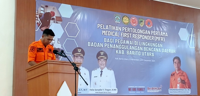 KaltengPress.co, Muara Teweh – Dalam rangka memperkuat profesionalisme dan kemampuan tanggap darurat, Badan Penanggulangan Bencana Daerah (BPBD) Kabupaten Barito Utara menyelenggarakan Pelatihan Pertolongan Pertama Medical First Responder (MFR). Sebanyak 45 pegawai termasuk 44 Aparatur Sipil Negara (ASN) dan 1 non-ASN mulai mengikuti kegiatan ini pada Selasa (25/11) di Aula Dinas Lingkungan Hidup (DLH) Barito Utara.