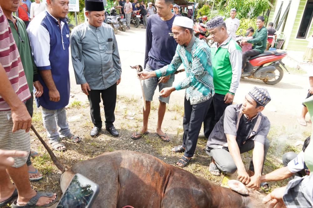 Dalam kesempatan tersebut, Rahmanto secara simbolis menyerahkan hewan kurban dari pemerintah daerah kepada pengurus langgar, sekaligus menyaksikan proses pemotongan hewan kurban yang akan dibagikan kepada masyarakat sekitar.
